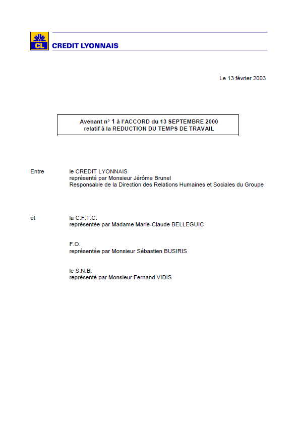 signé Avenant n°1 à l'accord relatif à la réduction du temps de travail du 13/09/2000