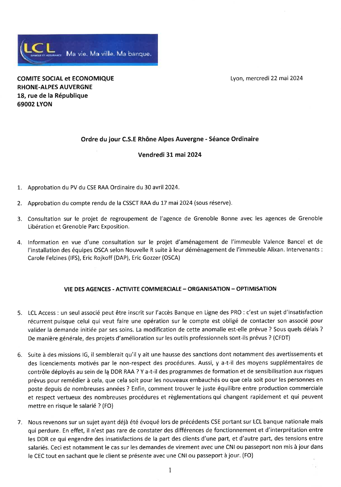 ODJ  CSE RAA du 31 mai 2024