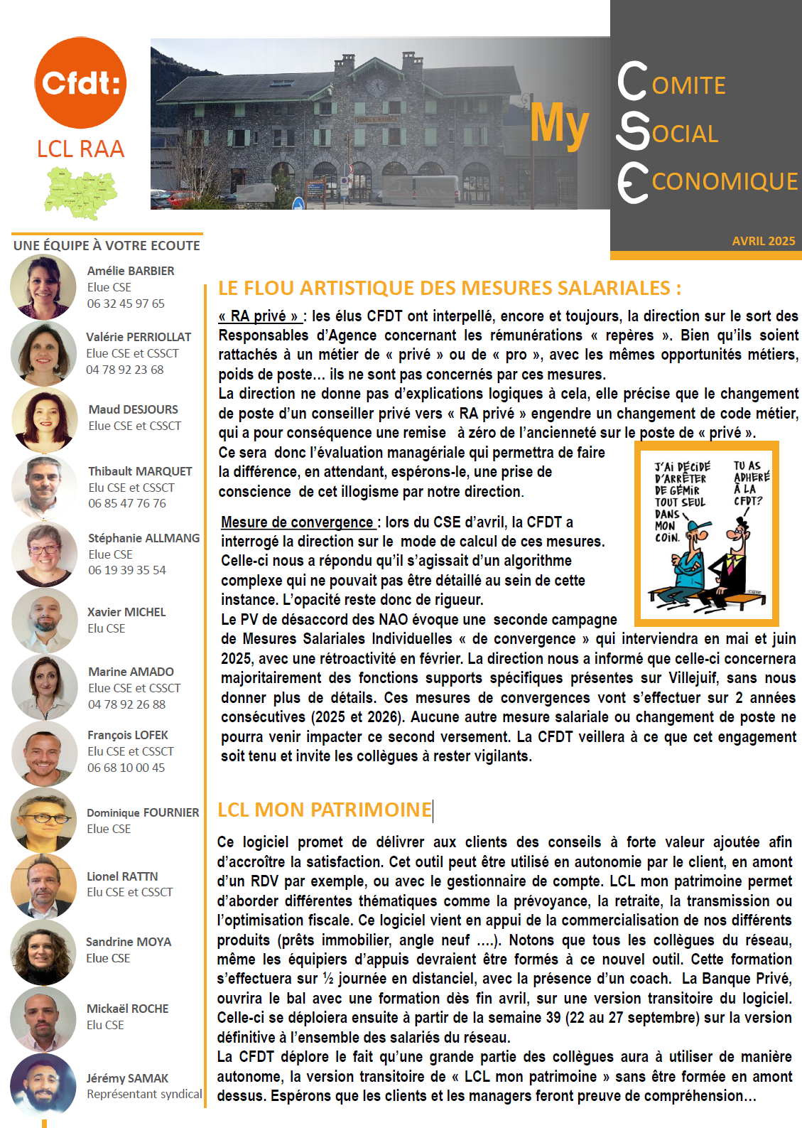 Veuillez toruver notre communication suite au CSE RAA d'Avril, notament sur les mesures salariales, LCL Mon Patrimoine, transfert des clients entre les PTF et Worklife
