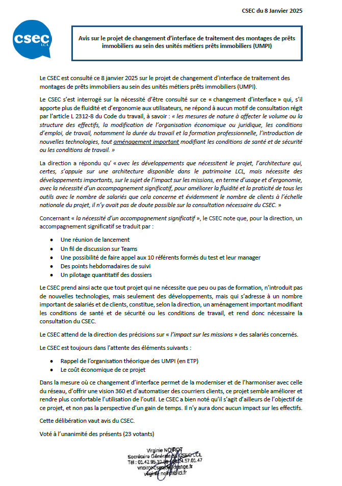 Avis unanime des élus du CSE CENTRAL.