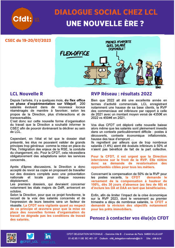 Retrouvez ici l'essentiel de la séance plénière du CSE Central de juillet 2023 avec la présentation de LCL nouvelle R, les résultats de la RVP réseau, le projet NECI et l'IA messagerie.