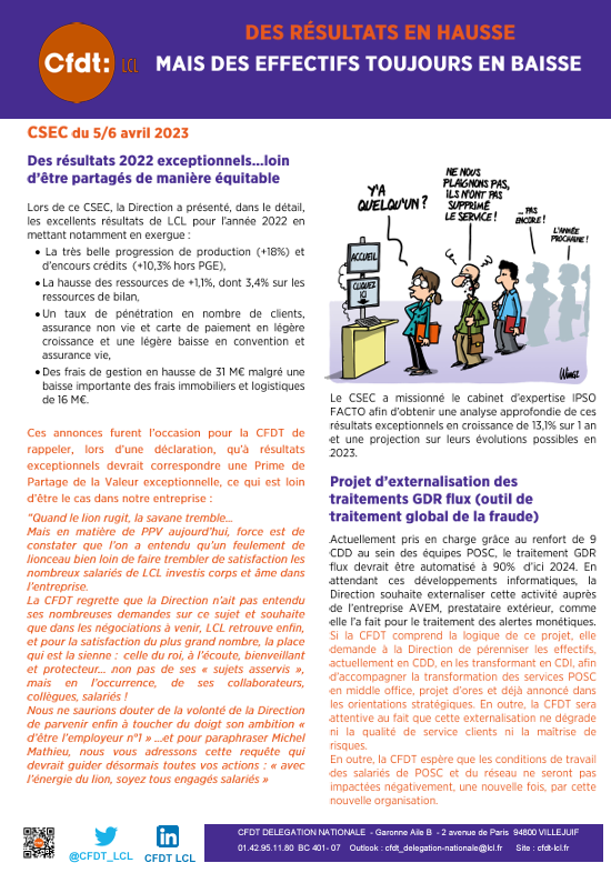 Vos élus CFDT vous présentent des sujets évoqués lors de cette plénière du CSE central, à savoir : les résultats exceptionnels de LCL, le projet d'externalisation des traitements GDR, Essentiel Pro, la maintenance dédiée et l'expérimentation automates et le contrat PRO A.